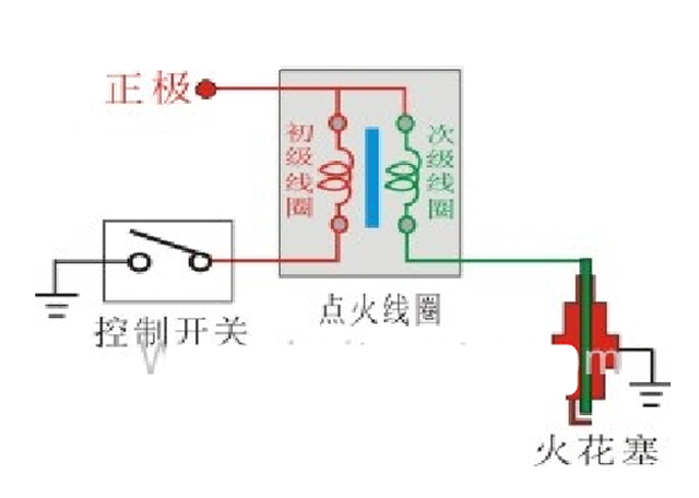 初級線圈和次級線圈有一個公共端接電源正極,初級線圈的另一端由控制開關(guān)控制,