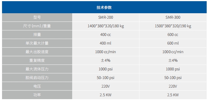 SMR-300定量機采用大容量設(shè)計結(jié)構(gòu),專為大膠量應(yīng)用所設(shè)計,產(chǎn)品可以滿足多種不同市場的應(yīng)用需求, 如鋰電、儲能、汽車、光伏、風(fēng)能等各領(lǐng)域。